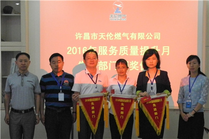 2016年5月31日上午8時(shí)30分,許昌天倫在九樓會(huì)議室舉行了“‘2016年服務(wù)質(zhì)量提升月’先進(jìn)部門頒獎(jiǎng)儀式”,對(duì)表現(xiàn)突出的內(nèi)部服務(wù)部門財(cái)務(wù)部、外部服務(wù)部門客服部及車用氣公司進(jìn)行了表彰,總經(jīng)辦成員及各部門相關(guān)負(fù)責(zé)人參加了頒獎(jiǎng)儀式。